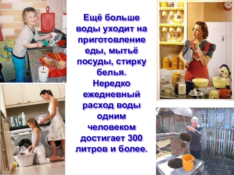 Слайд 18Ещё больше воды уходит на приготовление еды, мытьё посуды, стирку белья. Нередко