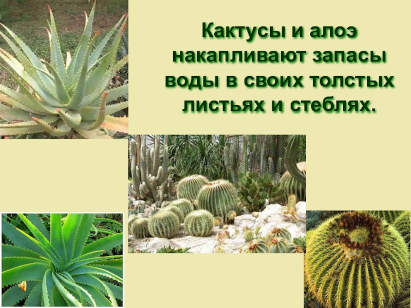Слайд 12Кактусы и алоэ накапливают запасы воды в своих толстых листьях и