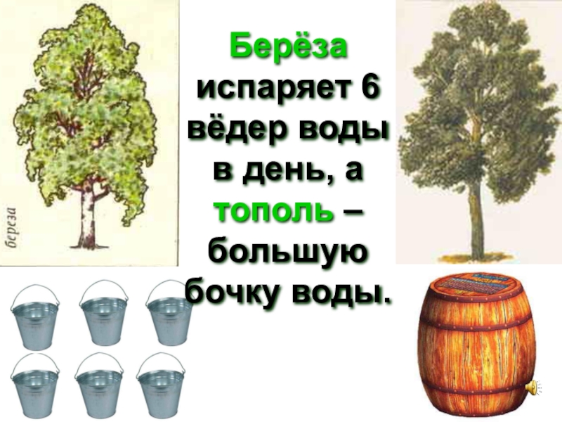 Слайд 14Берёза испаряет 6 вёдер воды в день, а тополь – большую
