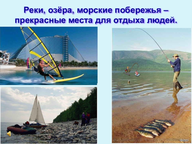 Слайд 20Реки, озёра, морские побережья – прекрасные места для отдыха людей.