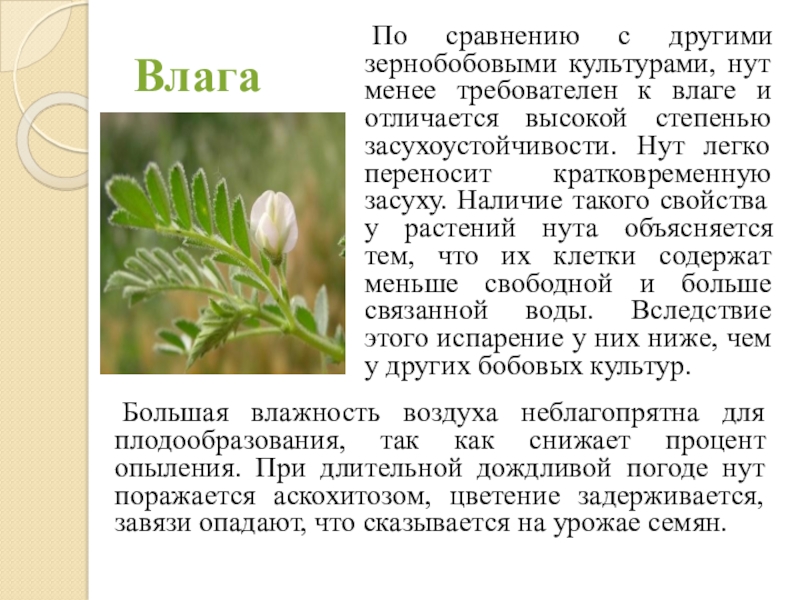 Большая влажность воздуха неблагопрятна для плодообразования, так как снижает процент опыления. При длительной дождливой погоде нут поражается аскохитозом, цветение задерживается, завязи опадают, что сказывается на урожае семян.