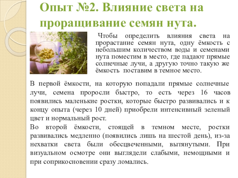 В первой ёмкости, на которую попадали прямые солнечные лучи, семена проросли быстро, то есть через 16 часов появились маленькие ростки, которые быстро развивались и к концу опыта (через 10 дней) приобрели интенсивный зеленый цвет и нормальный рост.