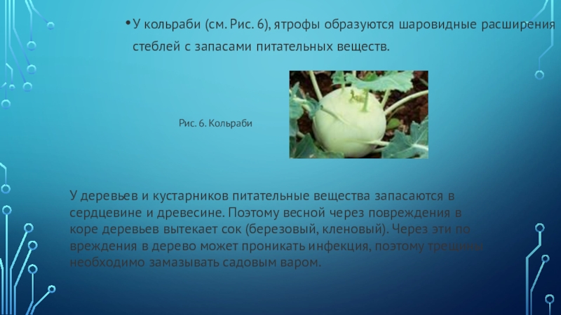 У деревьев и кустарников питательные вещества запасаются в сердцевине и древесине. Поэтому весной через повреждения в коре деревьев вытекает сок (березовый, кленовый). Через эти повреждения в дерево может проникать инфекция, поэтому трещины необходимо замазывать садовым варом.