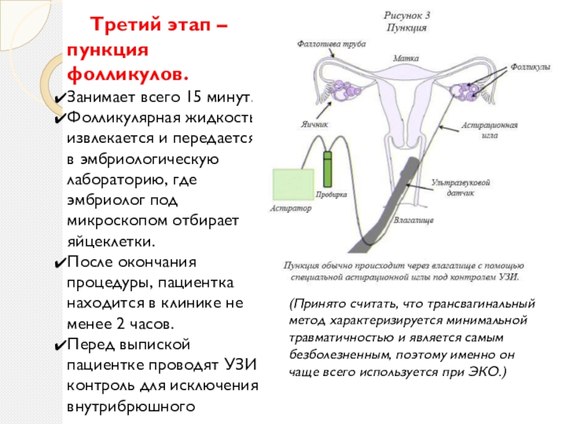 (Принято считать, что трансвагинальный метод характеризируется минимальной травматичностью и является самым безболезненным, поэтому именно он чаще всего используется при ЭКО.)
