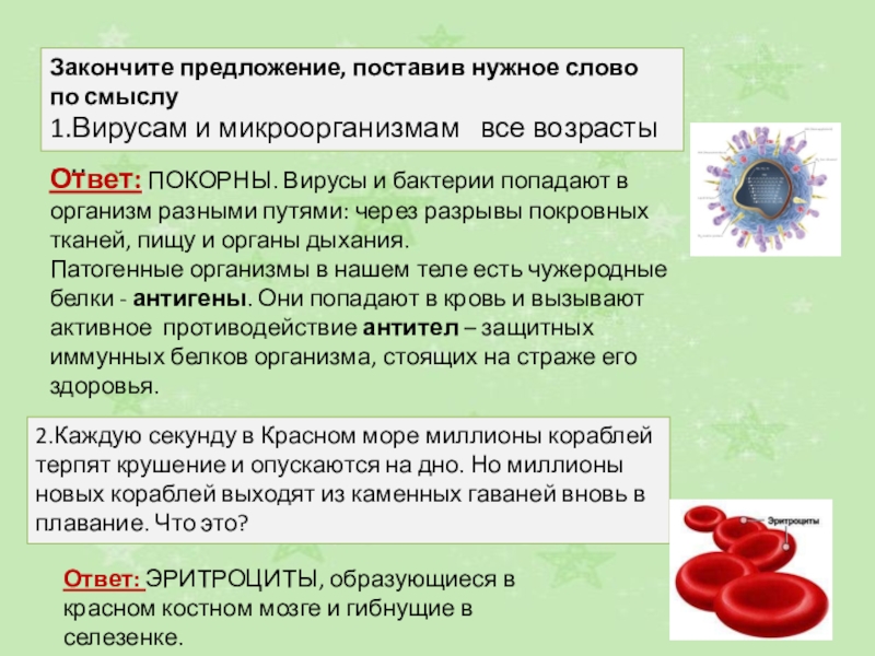 Патогенные организмы в нашем теле есть чужеродные белки - антигены. Они попадают в кровь и вызывают активное противодействие антител – защитных иммунных белков организма, стоящих на страже его здоровья.
