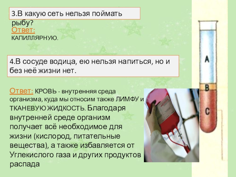 Ответ: КРОВЬ - внутренняя среда организма, куда мы относим также ЛИМФУ и ТКАНЕВУЮ ЖИДКОСТЬ. Благодаря внутренней среде организм получает всё необходимое для жизни (кислород, питательные вещества), а также избавляется от