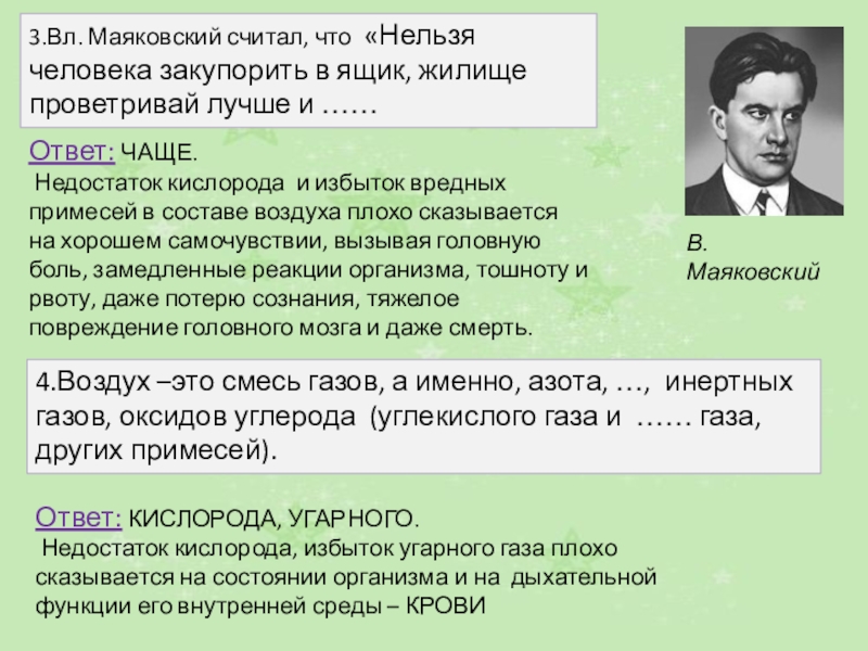 Недостаток кислорода и избыток вредных примесей в составе воздуха плохо сказывается на хорошем самочувствии, вызывая головную боль, замедленные реакции организма, тошноту и рвоту, даже потерю сознания, тяжелое повреждение головного мозга и даже смерть.