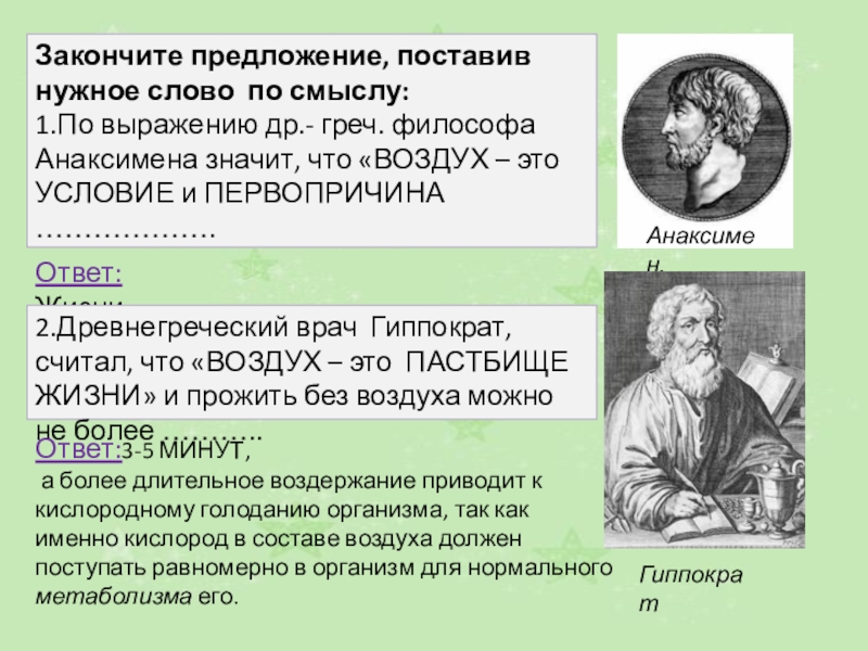 2.Древнегреческий врач Гиппократ, считал, что «ВОЗДУХ – это ПАСТБИЩЕ ЖИЗНИ» и прожить без воздуха можно не более ………..