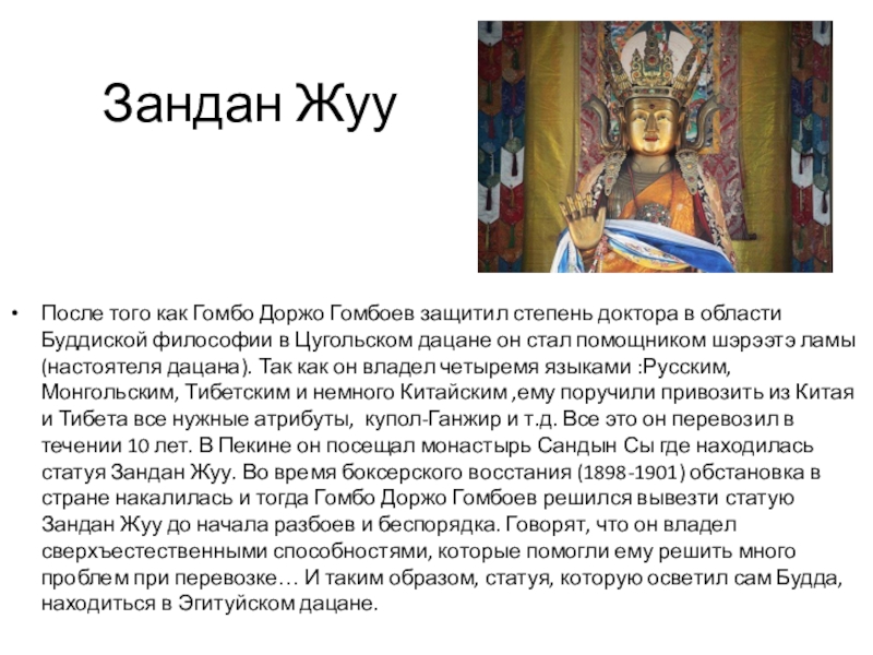 области Буддиской философии в Цугольском дацане он стал помощником шэрээтэ ламы(настоятеля дацана). Так как он владел четыремя языками :Русским, Монгольским, Тибетским и немного Китайским ,ему поручили привозить из Китая и Тибета все нужные атрибуты, купол-Ганжир и т.д. Все это он перевозил в течении 10 лет. В Пекине он посещал монастырь Сандын Сы где находилась статуя Зандан Жуу. Во время боксерского восстания (1898-1901) обстановка в стране накалилась и тогда Гомбо Доржо Гомбоев решился вывезти статую Зандан Жуу до начала разбоев и беспорядка. Говорят, что он владел сверхъестественными способностями, которые помогли ему решить много проблем при перевозке… И таким образом, статуя, которую осветил сам Будда, находиться в Эгитуйском дацане.