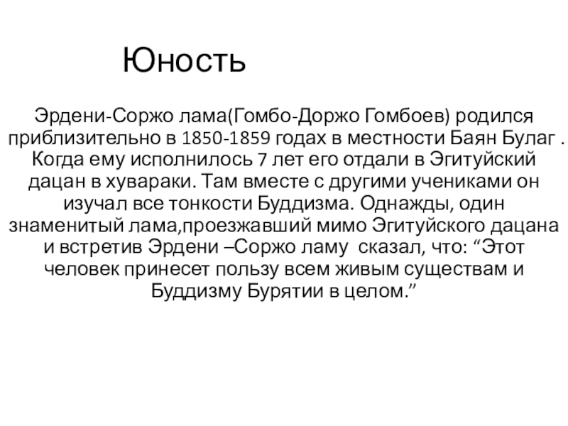 Эрдени-Соржо лама(Гомбо-Доржо Гомбоев) родился приблизительно в 1850-1859 годах в местности Баян