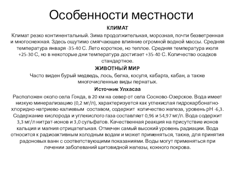 многоснежная. Здесь ощутимо смягчающее влияние огромной водной массы. Средняя температура января -35-40 С. Лето короткое, но теплое. Средняя температура июля +25-30 С, но в некоторые дни температура достигает +35-40 С. Количество осадков стандартное.