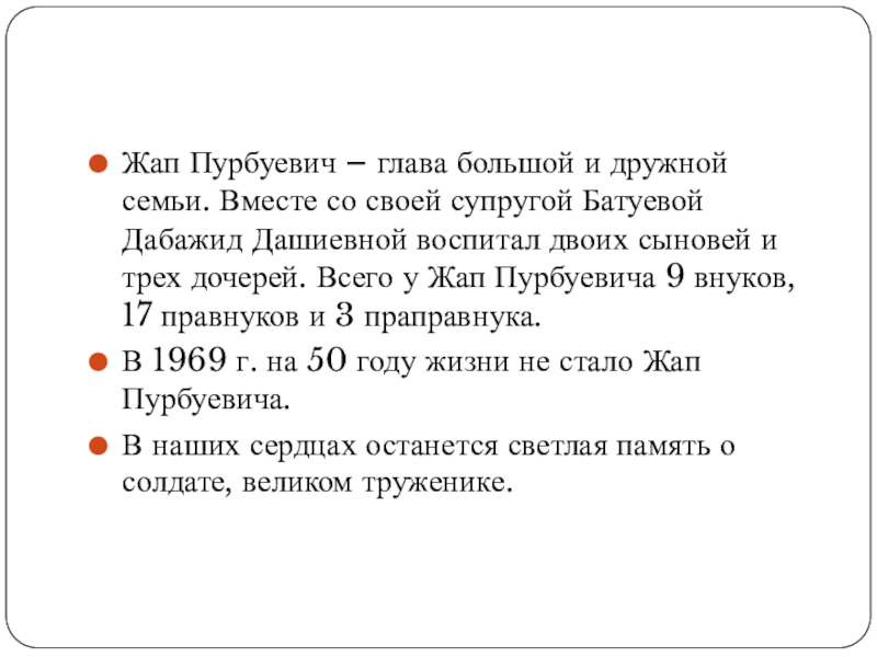 Средний из братьев, Бабасан Пурбуевич, родился в 1922 г. Окончил 4 класса в родном селе. С 5 по 7 класс учился в с. Иволга.