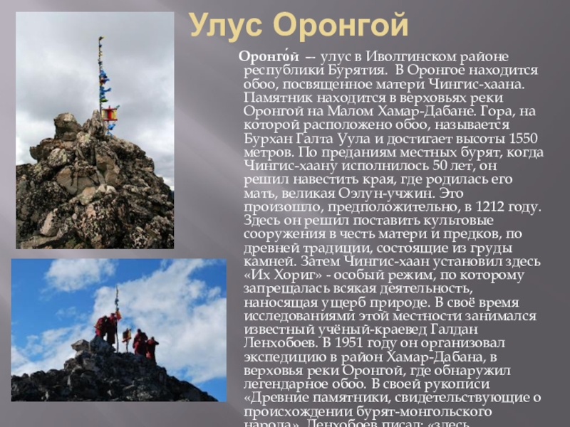 посвященное матери Чингис-хаана. Памятник находится в верховьях реки Оронгой на Малом Хамар-Дабане. Гора, на которой расположено обоо, называется Бурхан Галта Уула и достигает высоты 1550 метров. По преданиям местных бурят, когда Чингис-хаану исполнилось 50 лет, он решил навестить края, где родилась его мать, великая Оэлун-учжин. Это произошло, предположительно, в 1212 году. Здесь он решил поставить культовые сооружения в честь матери и предков, по древней традиции, состоящие из груды камней. Затем Чингис-хаан установил здесь «Их Хориг» - особый режим, по которому запрещалась всякая деятельность, наносящая ущерб природе. В своё время исследованиями этой местности занимался известный учёный-краевед Галдан Ленхобоев. В 1951 году он организовал экспедицию в район Хамар-Дабана, в верховья реки Оронгой, где обнаружил легендарное обоо. В своей рукописи «Древние памятники, свидетельствующие о происхождении бурят-монгольского народа», Ленхобоев писал: «здесь запрещалось землепашество, строительство городов, даже облавная охота. Здесь хоронили великих ханов».
