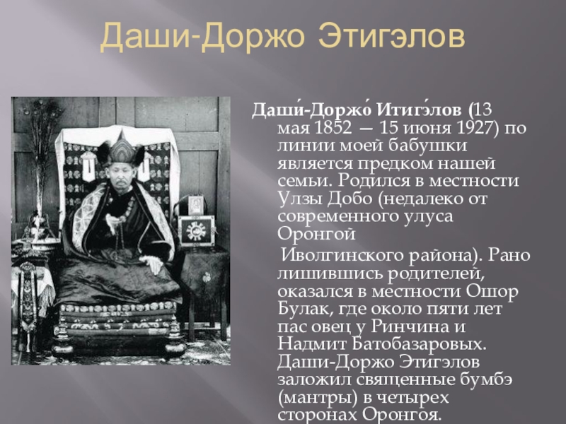 Даши́-Доржо́ Итигэ́лов (13 мая 1852 — 15 июня 1927) по линии моей бабушки
