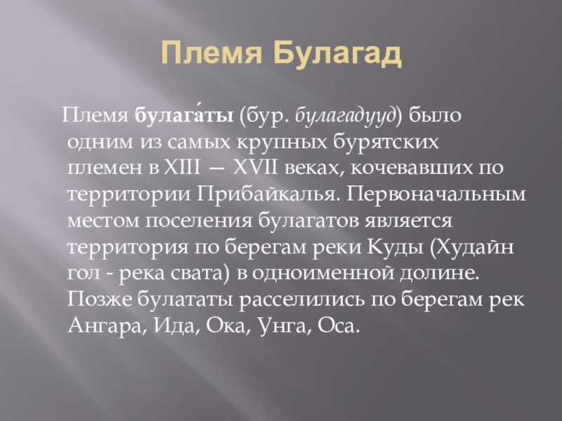 Племя булага́ты (бур. булагадууд) было одним из самых крупных бурятских племен в XIII — XVII веках, кочевавших