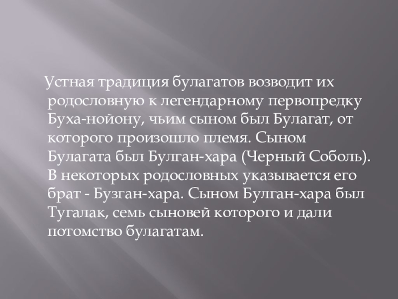 Слайд 3 Устная традиция булагатов возводит их родословную к легендарному первопредку Буха-нойону, чьим