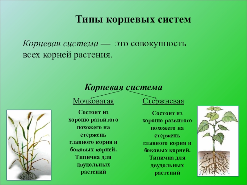 Состоит из хорошо развитого похожего на стержень главного корня и боковых корней. Типична для двудольных растений