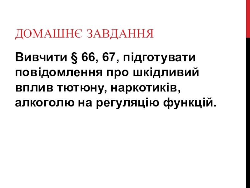 Вивчити § 66, 67, підготувати повідомлення про шкідливий вплив тютюну,