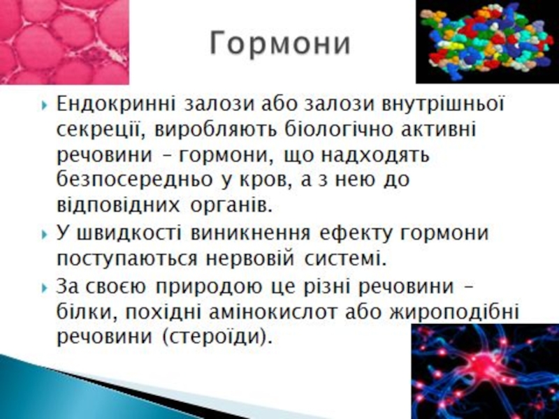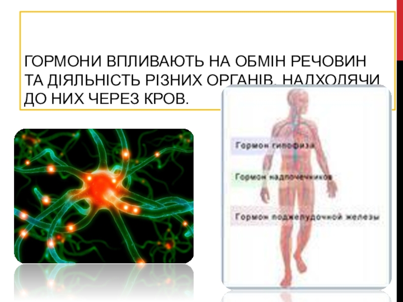 Слайд 14Гормони впливають на обмін речовин та діяльність різних органів, надходячи до