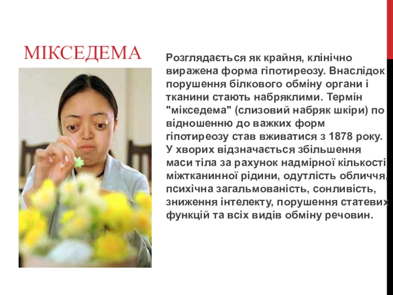 Мікседема - захворювання, обумовлене недостатнім забезпеченням органів і тканин гормонами щитовидної