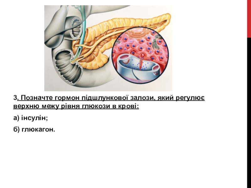 Слайд 513. Позначте гормон підшлункової залози, який регулює верхню межу рівня глюкози