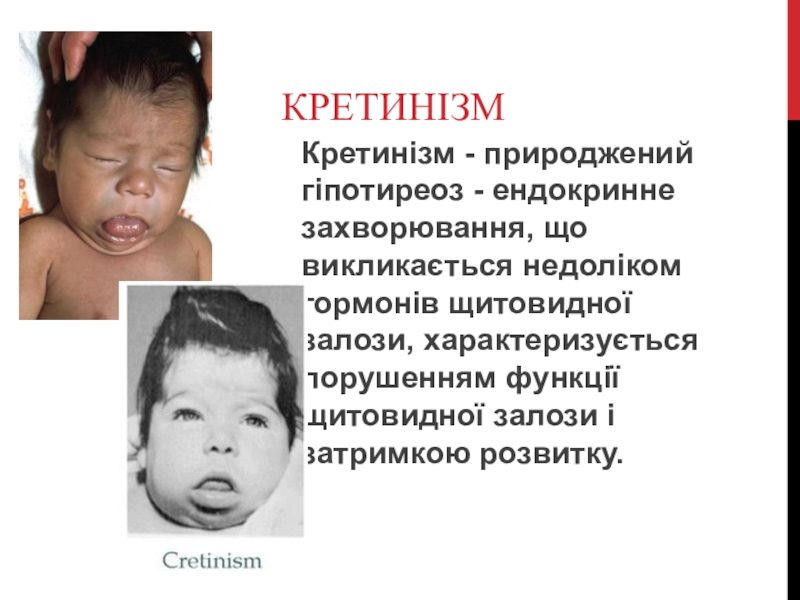 природжений гіпотиреоз - ендокринне захворювання, що викликається недоліком гормонів щитовидної залози, характеризується порушенням функції щитовидної залози і затримкою розвитку.