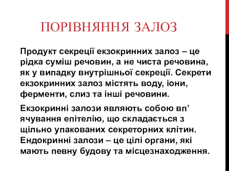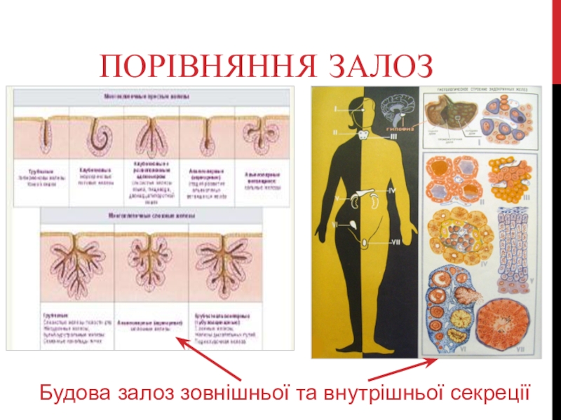 Екзокринні залози являють собою вп’ячування епітелію, що складається з щільно упакованих секреторних клітин. Ендокринні залози – це цілі органи, які мають певну будову та місцезнаходження.