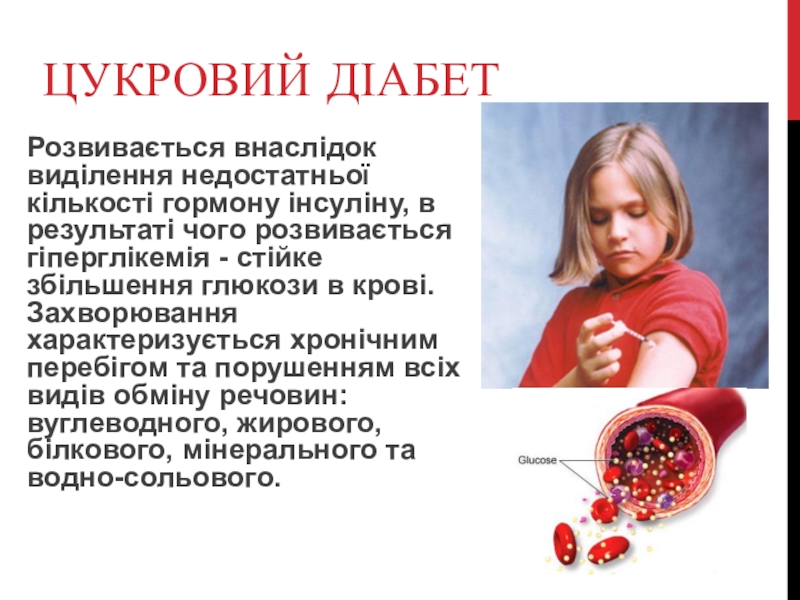 результаті чого розвивається гіперглікемія - стійке збільшення глюкози в крові. Захворювання характеризується хронічним перебігом та порушенням всіх видів обміну речовин: вуглеводного, жирового, білкового, мінерального та водно-сольового.