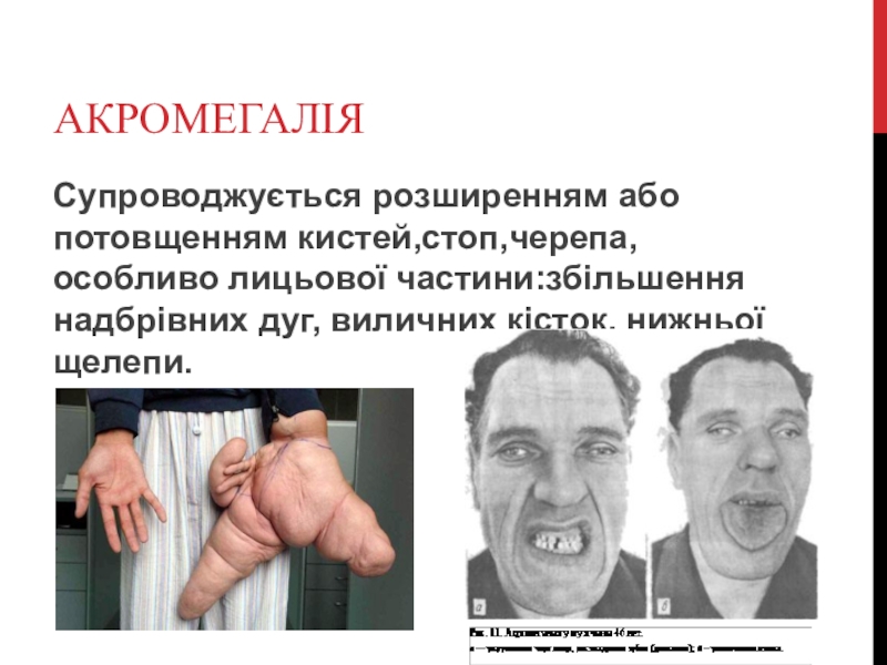 Супроводжується розширенням або потовщенням кистей,стоп,черепа, особливо лицьової частини:збільшення надбрівних дуг, виличних