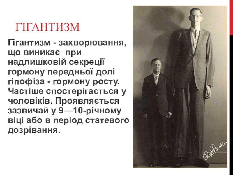 долі гіпофіза - гормону росту. Частіше спостерігається у чоловіків. Проявляється зазвичай у 9—10-річному віці або в період статевого дозрівання.