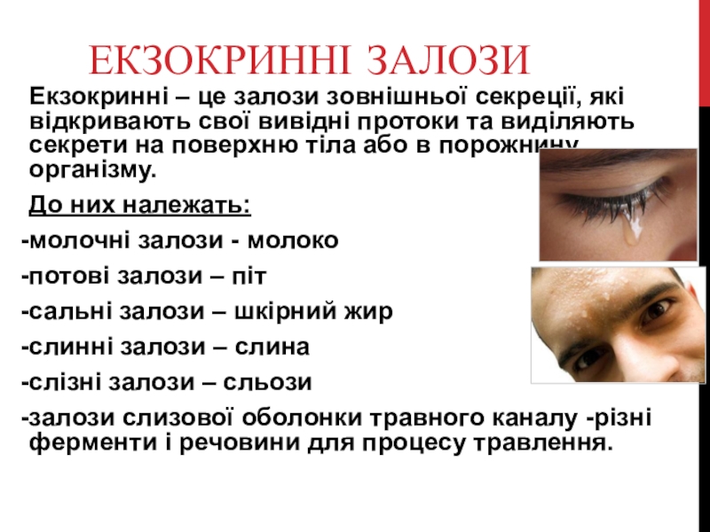не чиста речовина, як у випадку внутрішньої секреції. Секрети екзокринних залоз містять воду, іони, ферменти, слиз та інші речовини.