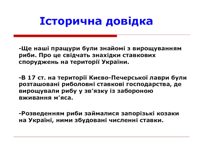 -В 17 ст. на території Києво-Печерської лаври були розташовані риболовні ставкові господарства, де вирощували рибу у зв’язку із забороною вживання м’яса.