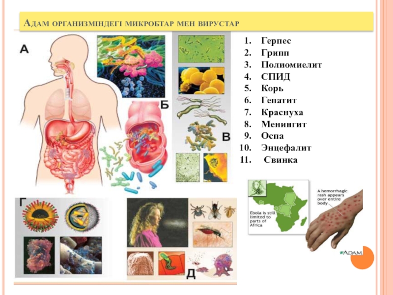 Адам организміндегі микробтар мен вирустарГерпесГриппПолиомиелитСПИДКорьГепатитКраснуха Менингит ОспаЭнцефалит Свинка
