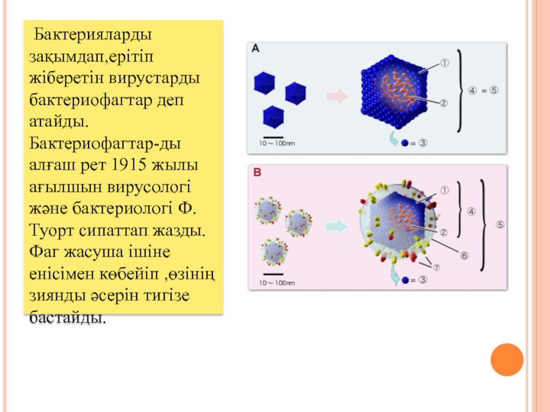Бактерияларды зақымдап,ерітіп жіберетін вирустарды бактериофагтар деп атайды.Бактериофагтар-ды алғаш рет 1915 жылы ағылшын вирусологі және бактериологі Ф.
