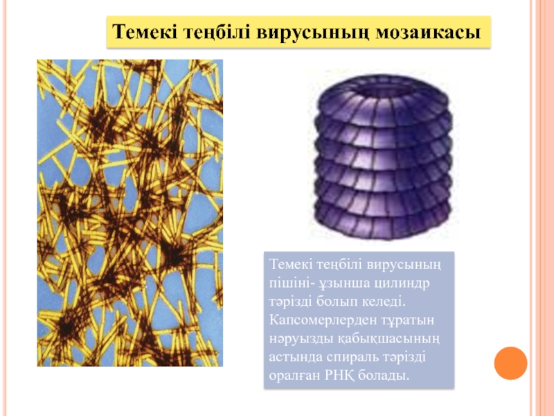 Темекі теңбілі вирусының мозаикасыТемекі теңбілі вирусының пішіні- ұзынша цилиндр тәрізді болып келеді. Капсомерлерден тұратын нәруызды қабықшасының астында