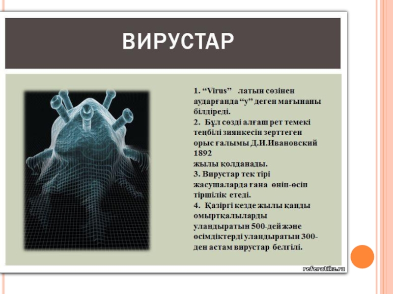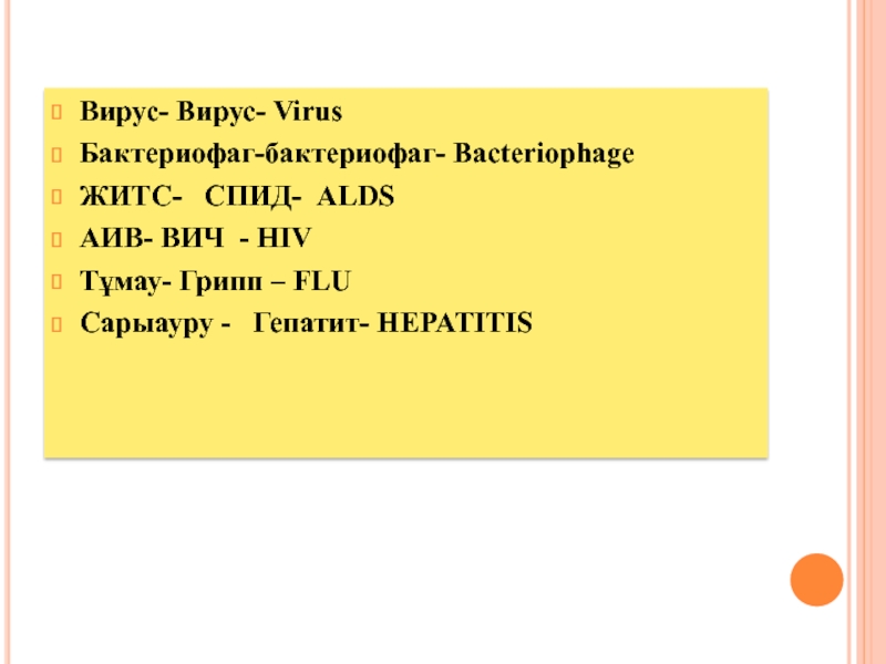Вирус- Вирус- VirusБактериофаг-бактериофаг- BacteriophageЖИТС-  СПИД- АLDSАИВ- ВИЧ - HIVТұмау- Грипп – FLUСарыауру -  Гепатит- HEPATITIS