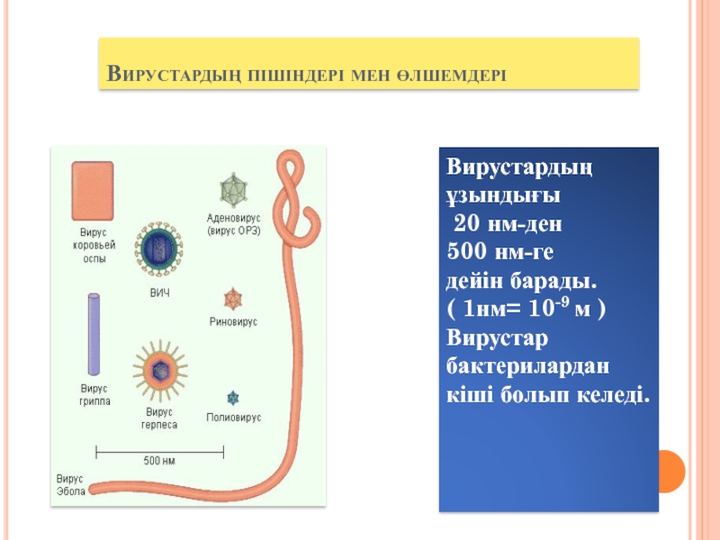 Вирустардың пішіндері мен өлшемдеріВирустардың ұзындығы 20 нм-ден 500 нм-ге дейін барады.( 1нм= 10-9 м )Вирустар бактерилардан кіші