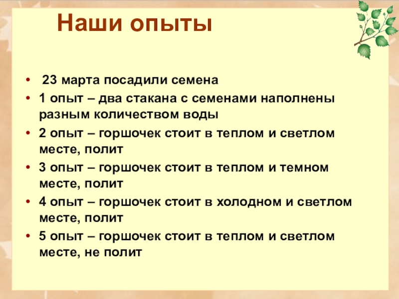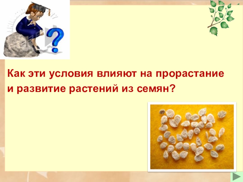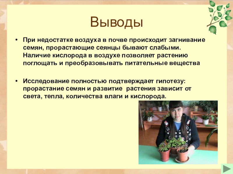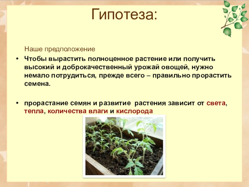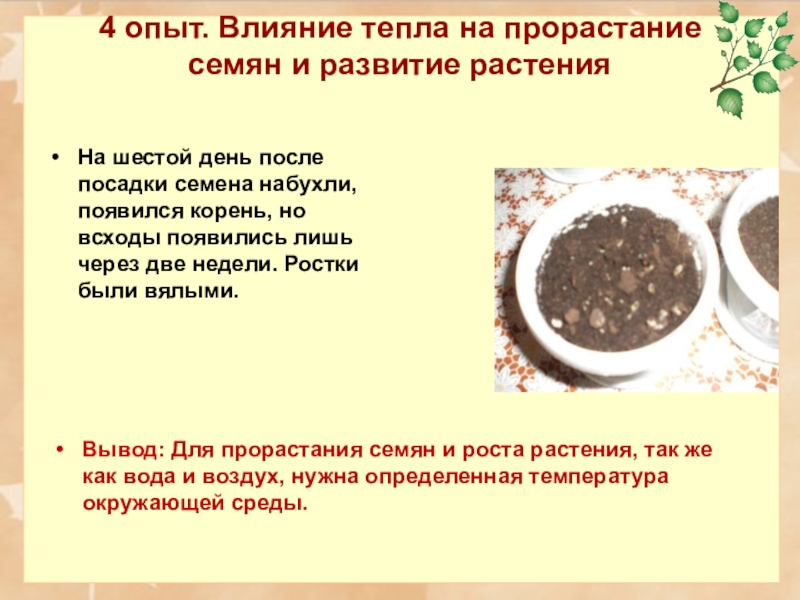 Вывод: Для прорастания семян и роста растения, так же как вода и воздух, нужна определенная температура окружающей среды.