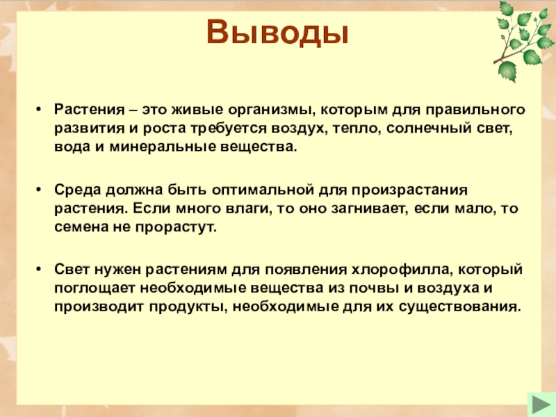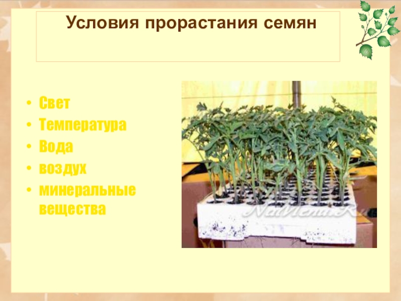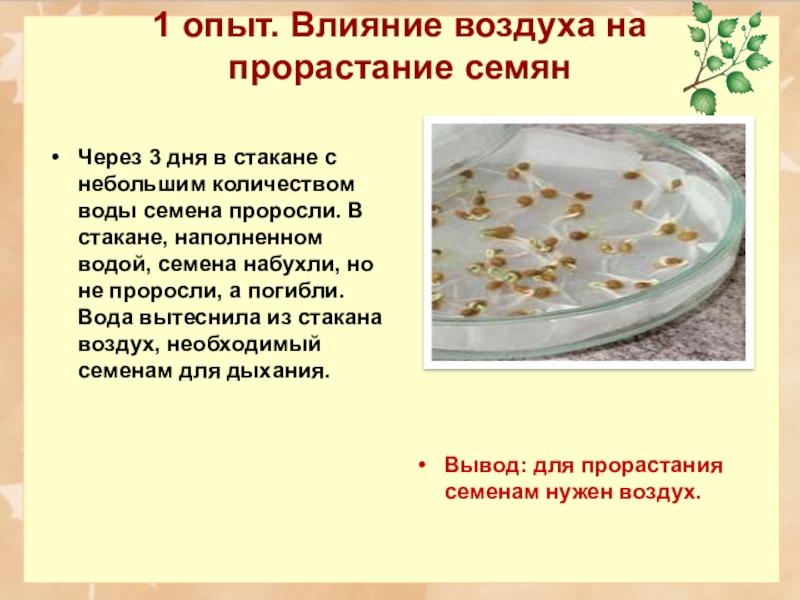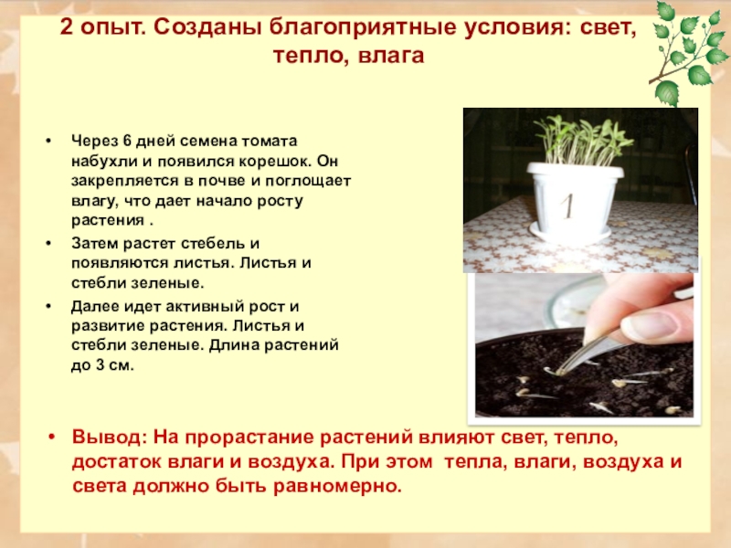 Вывод: На прорастание растений влияют свет, тепло, достаток влаги и воздуха. При этом тепла, влаги, воздуха и света должно быть равномерно.