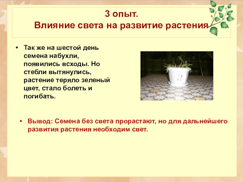Вывод: Семена без света прорастают, но для дальнейшего развития растения необходим свет.