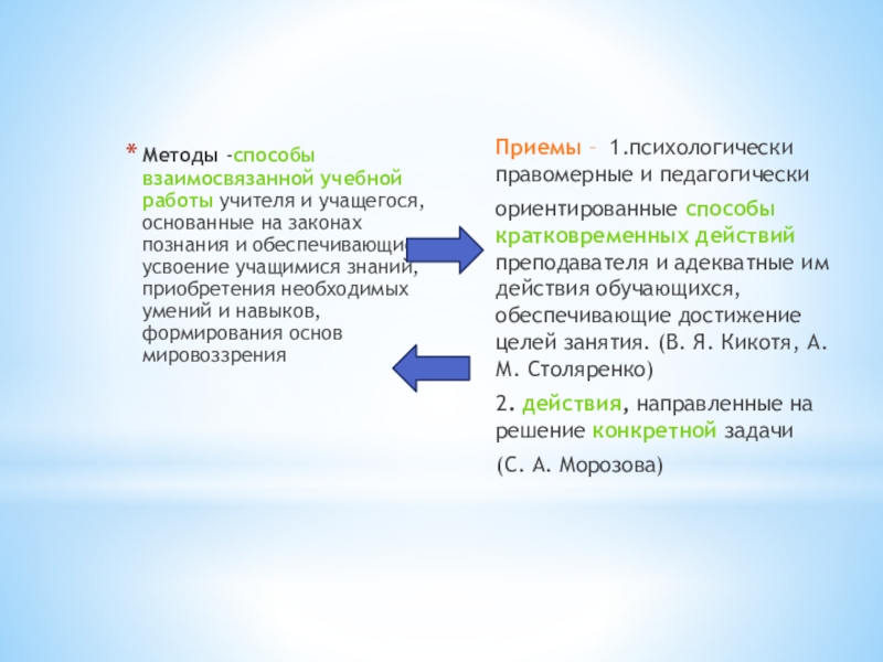 ориентированные способы кратковременных действий преподавателя и адекватные им действия обучающихся, обеспечивающие достижение целей занятия. (В. Я. Кикотя, А. М. Столяренко)