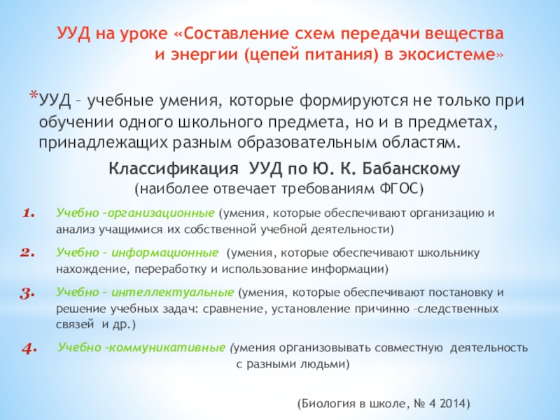Классификация УУД по Ю. К. Бабанскому (наиболее отвечает требованиям ФГОС)