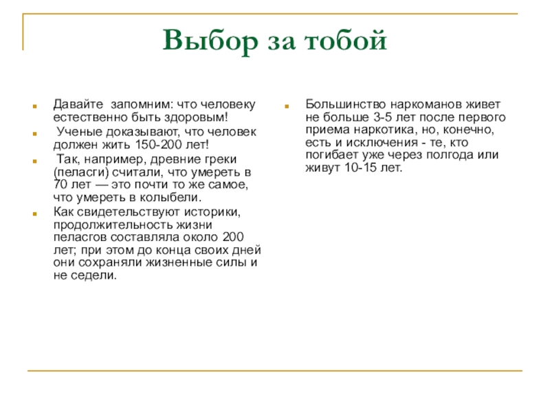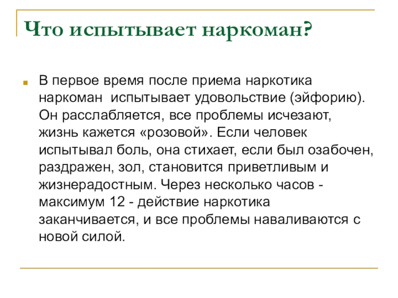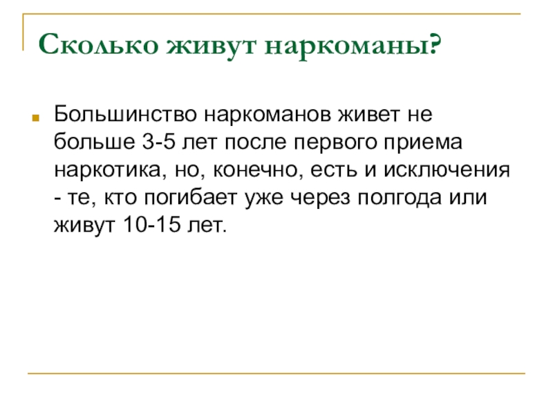 Большинство наркоманов живет не больше 3-5 лет после первого приема наркотика, но, конечно, есть и исключения - те, кто погибает уже через полгода или живут 10-15 лет.
