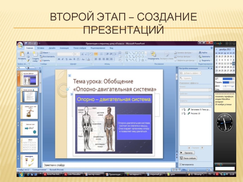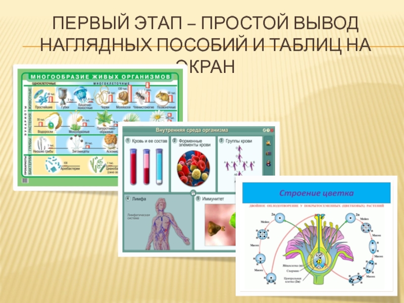 Слайд 17Первый этап – простой вывод наглядных пособий и таблиц на экран