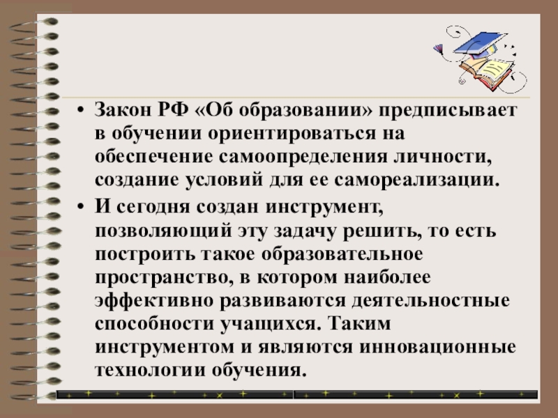 Слайд 16Закон РФ «Об образовании» предписывает в обучении ориентироваться на обеспечение самоопределения