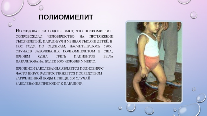 Причиной заболевания является полиовирус. Часто вирус распространяется посредством загрязненной воды и пищи. 200 случай заболевания приводит к параличу.