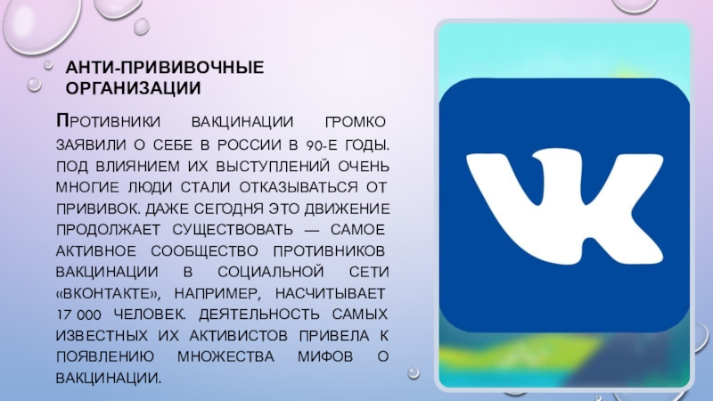 90-е годы. Под влиянием их выступлений очень многие люди стали отказываться от прививок. Даже сегодня это движение продолжает существовать — самое активное сообщество противников вакцинации в социальной сети «ВКонтакте», например, насчитывает 17 000 человек. Деятельность самых известных их активистов привела к появлению множества мифов о вакцинации.
