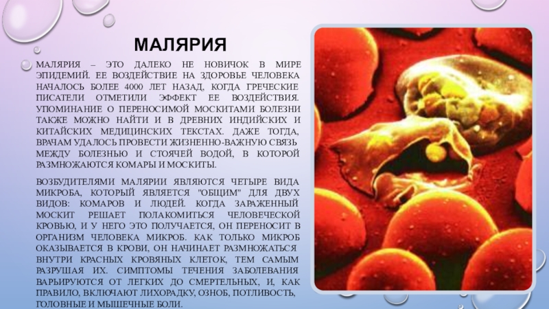 Возбудителями малярии являются четыре вида микроба, который является "общим" для двух видов: комаров и людей. Когда зараженный москит решает полакомиться человеческой кровью, и у него это получается, он переносит в организм человека микроб. Как только микроб оказывается в крови, он начинает размножаться внутри красных кровяных клеток, тем самым разрушая их. Симптомы течения заболевания варьируются от легких до смертельных, и, как правило, включают лихорадку, озноб, потливость, головные и мышечные боли.