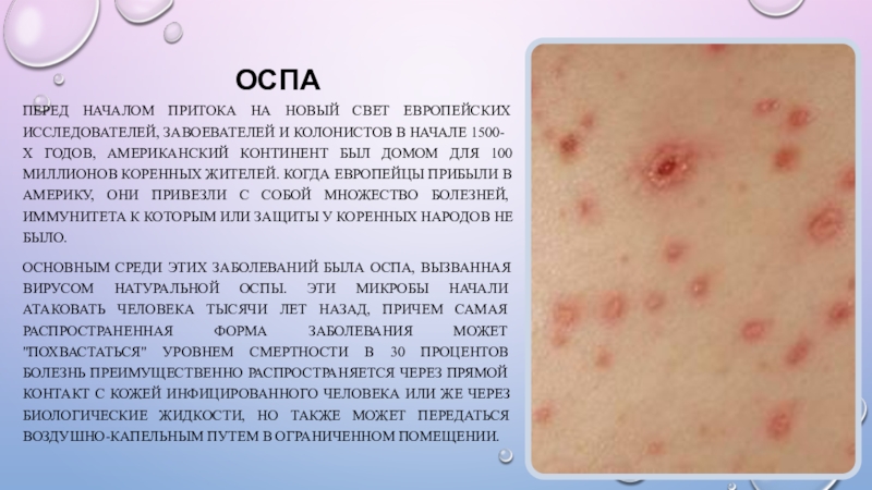 Основным среди этих заболеваний была оспа, вызванная вирусом натуральной оспы. Эти микробы начали атаковать человека тысячи лет назад, причем самая распространенная форма заболевания может "похвастаться" уровнем смертности в 30 процентов Болезнь преимущественно распространяется через прямой контакт с кожей инфицированного человека или же через биологические жидкости, но также может передаться воздушно-капельным путем в ограниченном помещении.