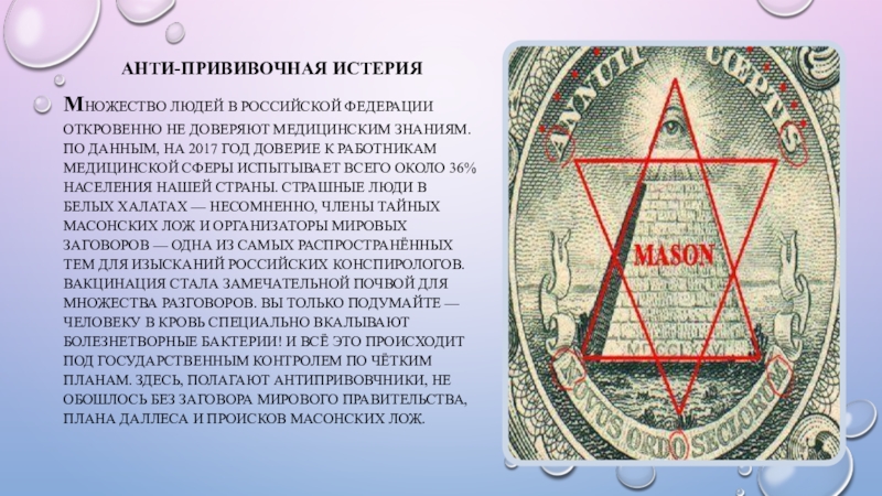 По данным, на 2017 год доверие к работникам медицинской сферы испытывает всего около 36% населения нашей страны. Страшные люди в белых халатах — несомненно, члены тайных масонских лож и организаторы мировых заговоров — одна из самых распространённых тем для изысканий российских конспирологов. Вакцинация стала замечательной почвой для множества Разговоров. Вы только подумайте — человеку в кровь специально вкалывают болезнетворные бактерии! И всё это происходит под государственным контролем по чётким планам. Здесь, полагают антипривовчники, не обошлось без заговора мирового правительства, плана Даллеса и происков масонских лож.
